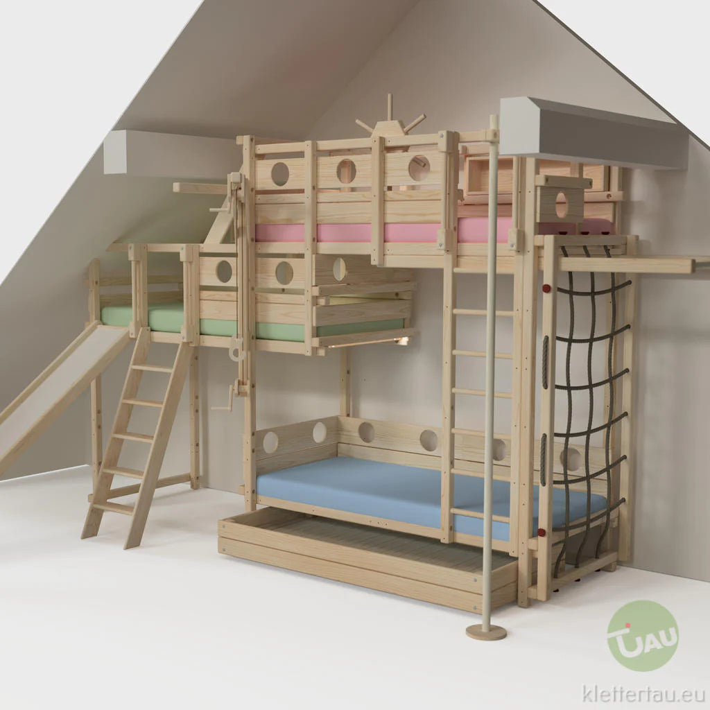 Zimmer mit Dachschrägen können besonders herausfordernd sein. Dank unseres Modulsystems können wir euch aber eine optimale Raumnutzung bieten. Gerne visualisieren wir euch vorab einen Vorschlag in 3D für euer individuelles Tau Abenteuerbett.