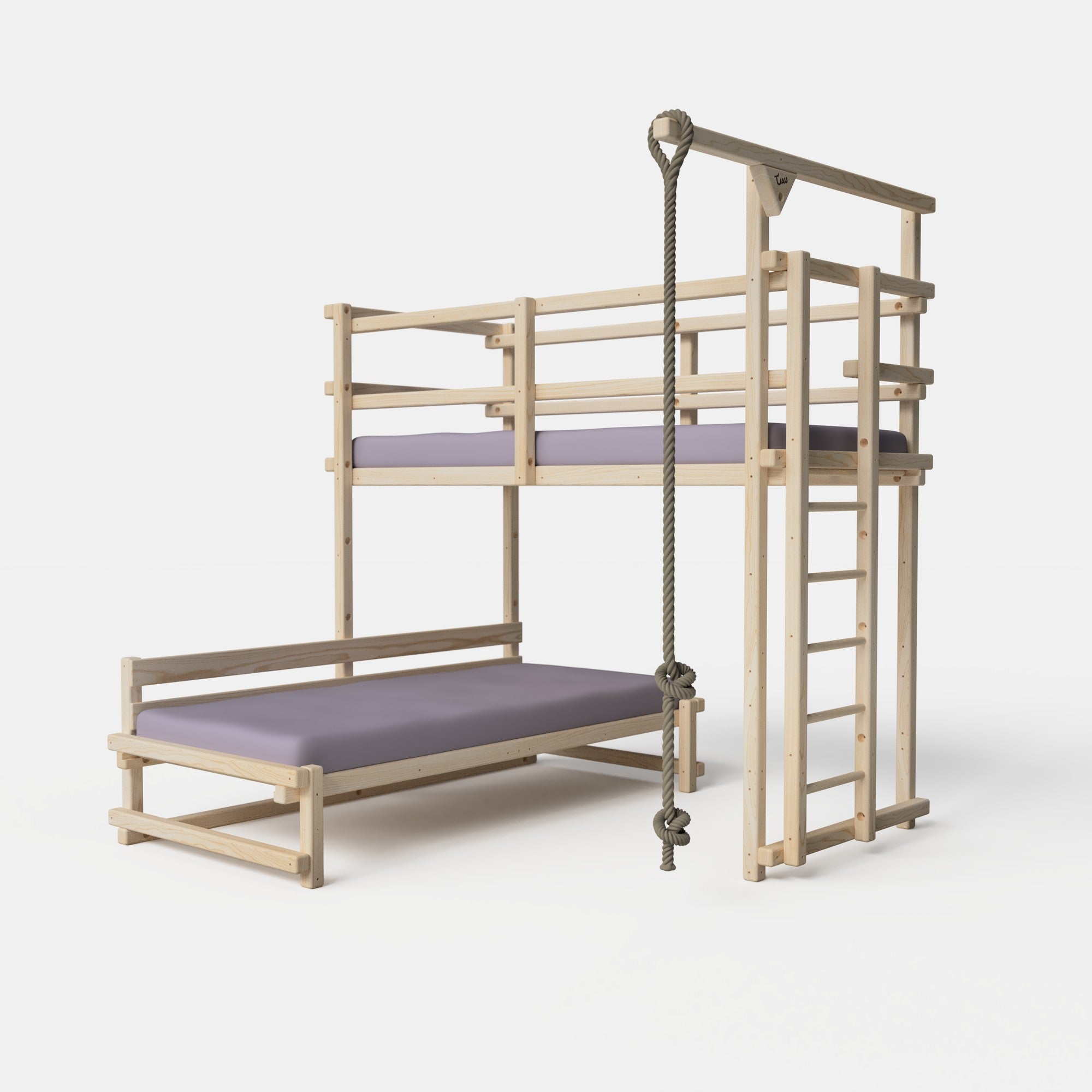 Es besteht aus einer Sofaliege und einem Hochbett. Das Hochbett ist dabei um 90° gedreht. Am Bett können problemlos die meisten unserer Spiel- und Klettergeräte montiert werden.