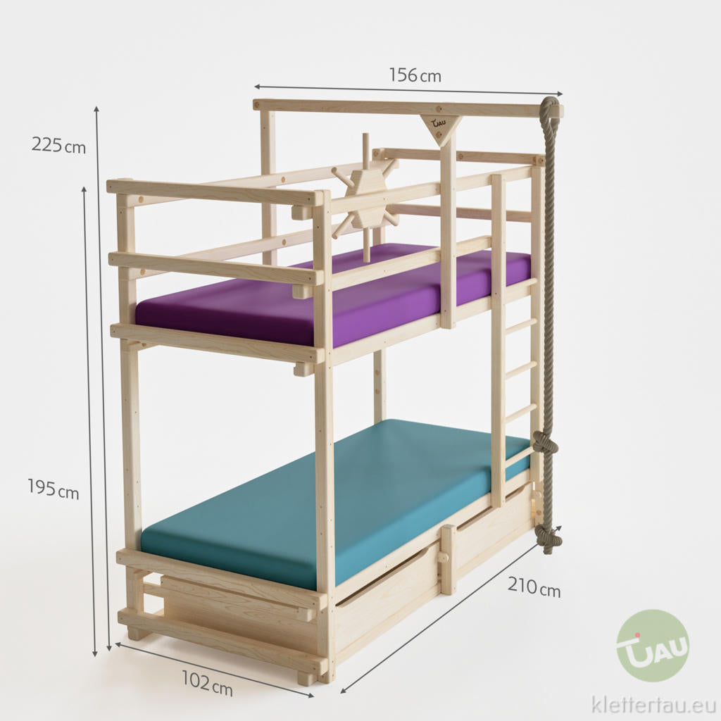 Platz zum Spielen und Schlafen findet sich in der kleinsten Hütte bzw. im TAU-Abenteuerbett. Auf nur ca. 2 m² entfaltet sich viel Raum zum Spielen, Klettern und natürlich auch zum Schlafen. Mit seinen zwei Liegeflächen bietet das Kletterbett Schlafflächen für zwei Kinder. Oder ihr wandelt eine Schlaffläche zur Spielfläche um. Mit der praktischen Schublade unter dem Hochbett ist das Spielzeug oder zusätzliches Bettzeug immer sofort zur Hand.