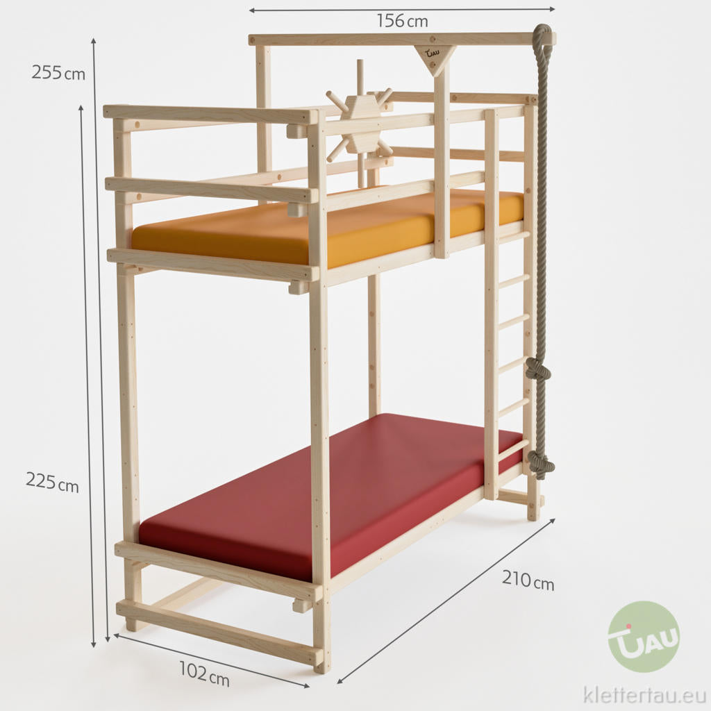 Platz zum Spielen und Schlafen findet sich in der kleinsten Hütte bzw. im TAU-Abenteuerbett. Auf nur ca. 2 m² entfaltet sich viel Raum zum Spielen, Klettern und natürlich auch zum Schlafen. Mit seinen zwei Liegeflächen bietet das Kletterbett Schlafflächen für zwei Kinder. Oder ihr wandelt eine Schlaffläche zur Spielfläche um. Mit der praktischen Schublade unter dem Hochbett ist das Spielzeug oder zusätzliches Bettzeug immer sofort zur Hand.