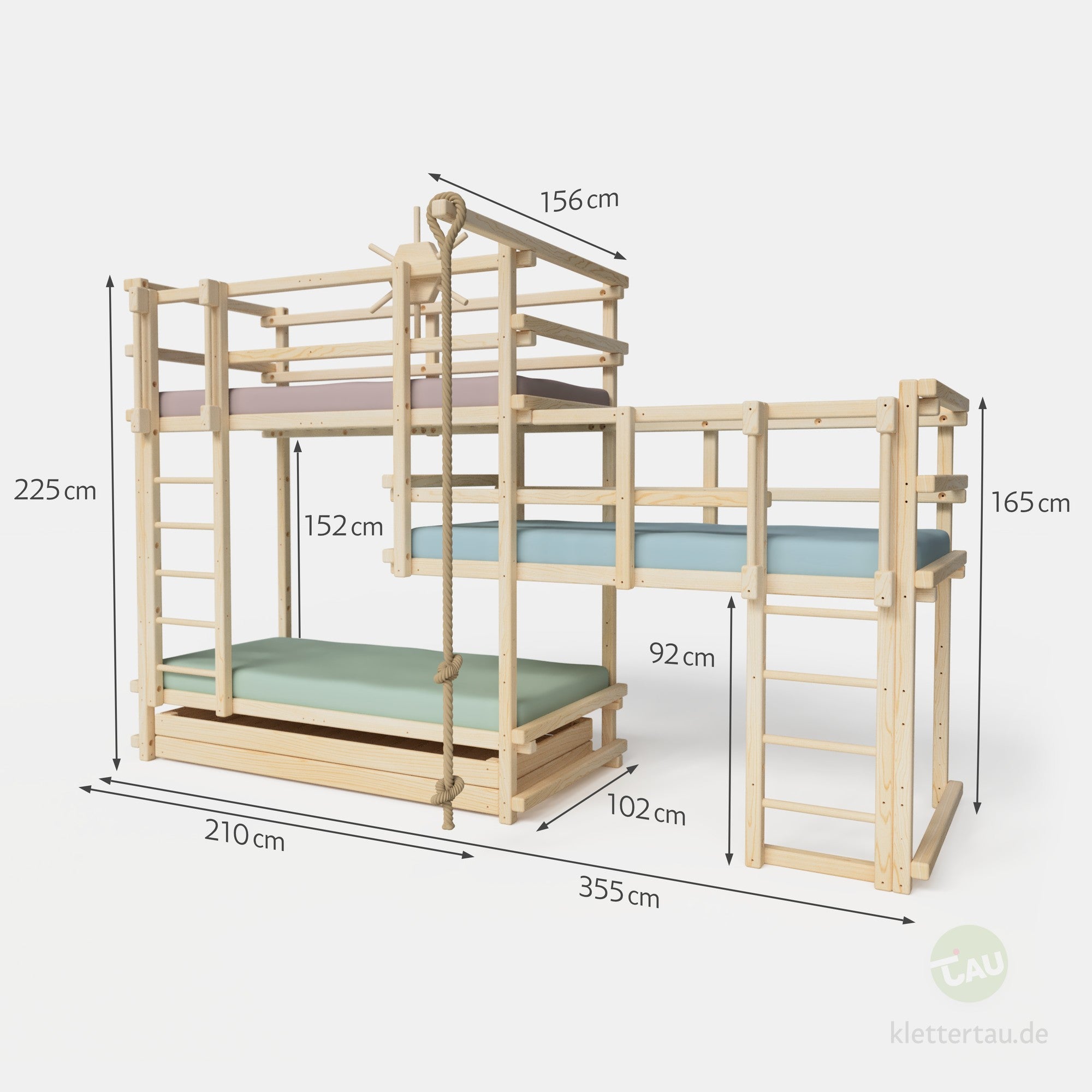 Auch dieses Dreifach-Etagenbett ist Teil unseres TAU-Modulsystems. Die drei Liegeebenen sind zu 3/4 gegeneinander versetzt, was dem Bett seine besondere, interessante Form verleiht. Diese durchdachte Konstruktion schafft nicht nur drei gemütliche Schlafplätze, sondern lädt auch zum Spielen und Entdecken ein. Auf jeder Ebene könnt ihr gemütliche, kuschelige Bereiche schaffen, die erklettert werden können.