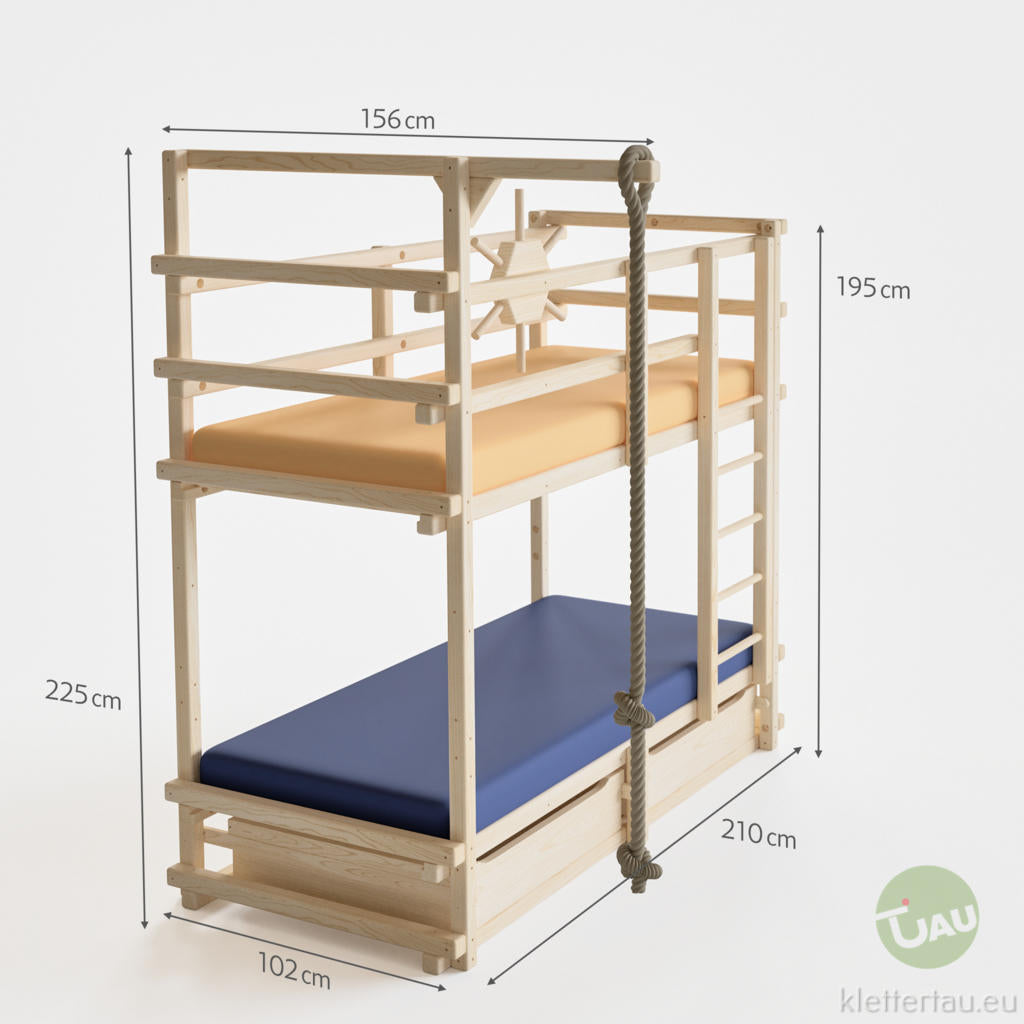 Platz zum Spielen und Schlafen findet sich in der kleinsten Hütte bzw. im TAU-Abenteuerbett. Auf nur ca. 2 m² entfaltet sich viel Raum zum Spielen, Klettern und natürlich auch zum Schlafen. Mit seinen zwei Liegeflächen bietet das Kletterbett Schlafflächen für zwei Kinder. Oder ihr wandelt eine Schlaffläche zur Spielfläche um. Mit der praktischen Schublade unter dem Hochbett ist das Spielzeug oder zusätzliches Bettzeug immer sofort zur Hand.