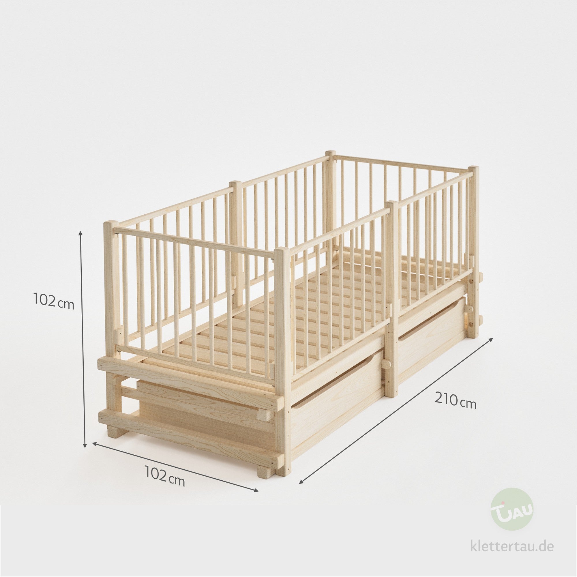 Das mitwachsende Babybett ist so konzipiert, dass es mit eurem Baby mitwächst. Mit wenig neuen Balken, könnt ihr beispielsweise die Liegehöhe des Bettes verstellen oder das Bett zu einem Juniorbett oder einem gemütlichen Sofa umbauen. Sprecht uns bei Wünschen einfach an.