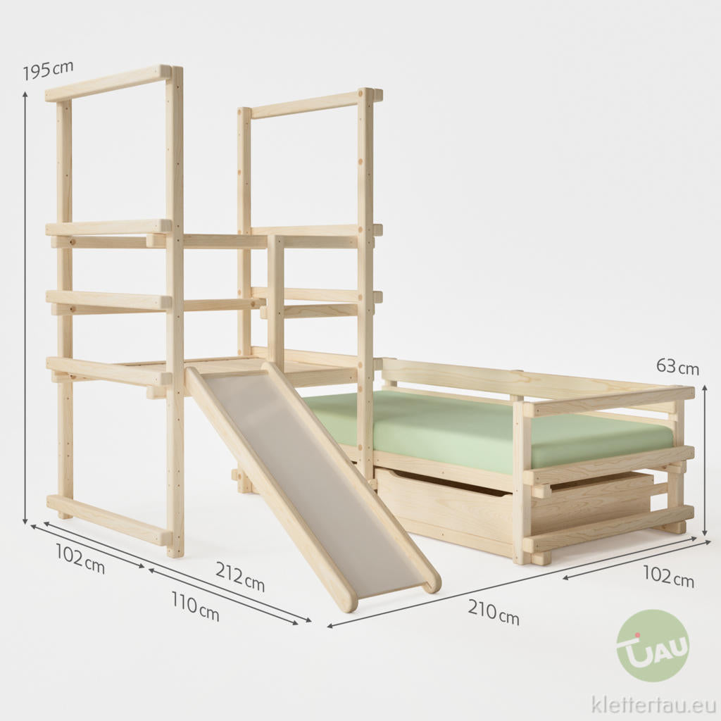 Dieses Kleinkindbett von TAU ist nur auf den ersten Blick ungewöhnlich. Mit dem Spielturm neben einer Sofaliege habt ihr eine praktische Kombination, die auch prima für Dachschrägen geeignet ist. DIe kleine Rutsche garantiert viel Spaß und bietet gleichzeitig eine tolle Klettermöglichkeit.