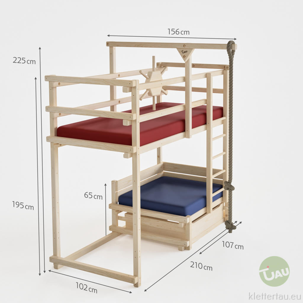 Ihr wollt, dass eure Kinder gern in Ihr Bett gehen? Dann ist unser Piratenbett mit Kuschelecke genau das Richtige für sie. Denn es ist ihr eigenes Reich mit Kletterseil und Steuerrad. Tagsüber können sie mit ihren Freunden darin spielen. So werden nicht nur Geschicklichkeit und Bewegung gefördert, sondern auch die Fantasie eurer Kinder angeregt. Und nachts bietet ihr geliebtes Stockbett ein sicheres Reich für süße Träume.