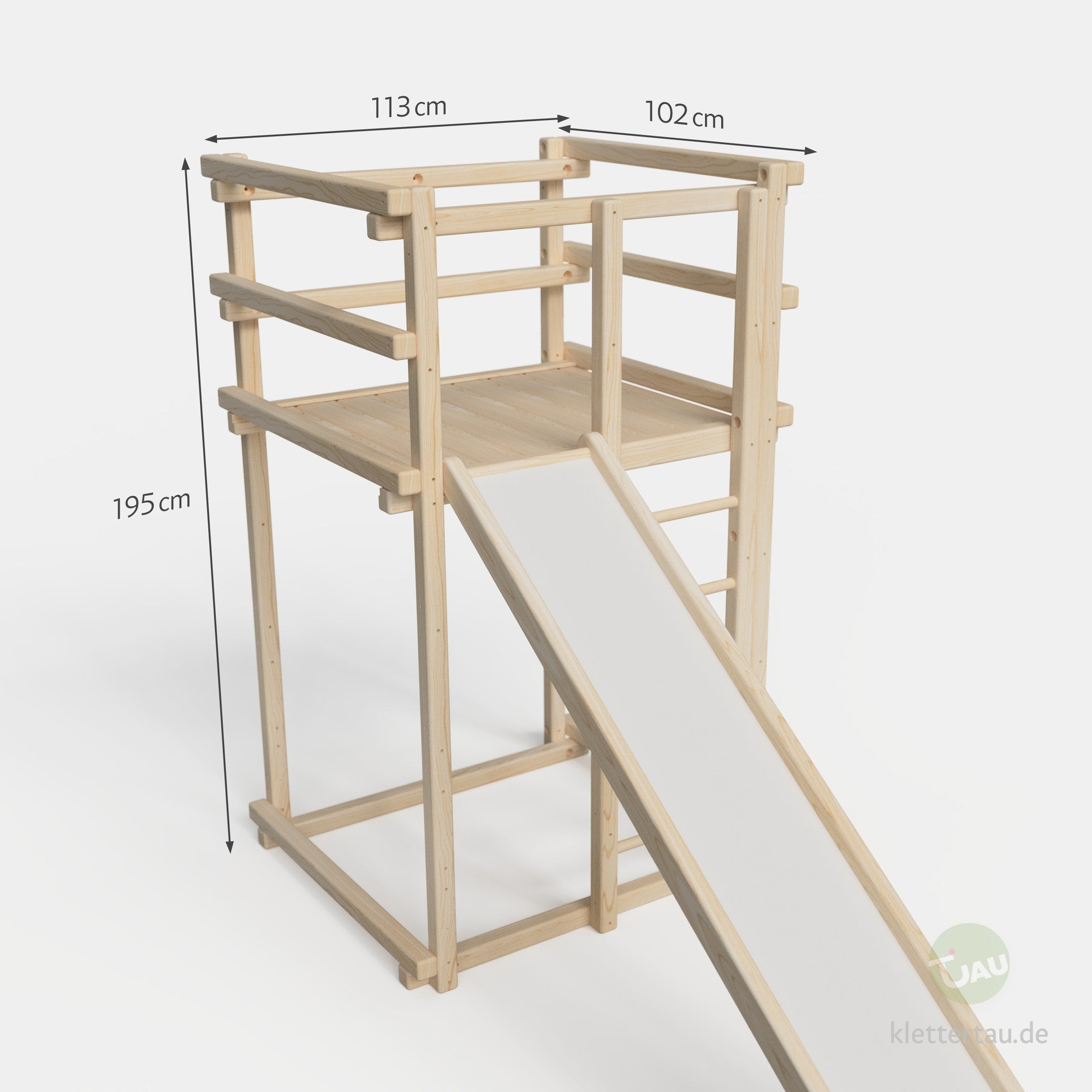 Der Spielturm ist eine beliebte Erweiterung um das Bett noch größer zu machen, macht aber auch alleinstehend viel Spaß. Wenn der Platz da ist, können hier auch gut die größeren Module wie Kletternetz, Sprossenwand und co. angebracht werden. Standardmäßig ist die Spielfläche und die Rutsche auf 130 cm Höhe befestigt. Die Höhe kann aber auch angepasst werden. Sprecht uns dafür einfach an.